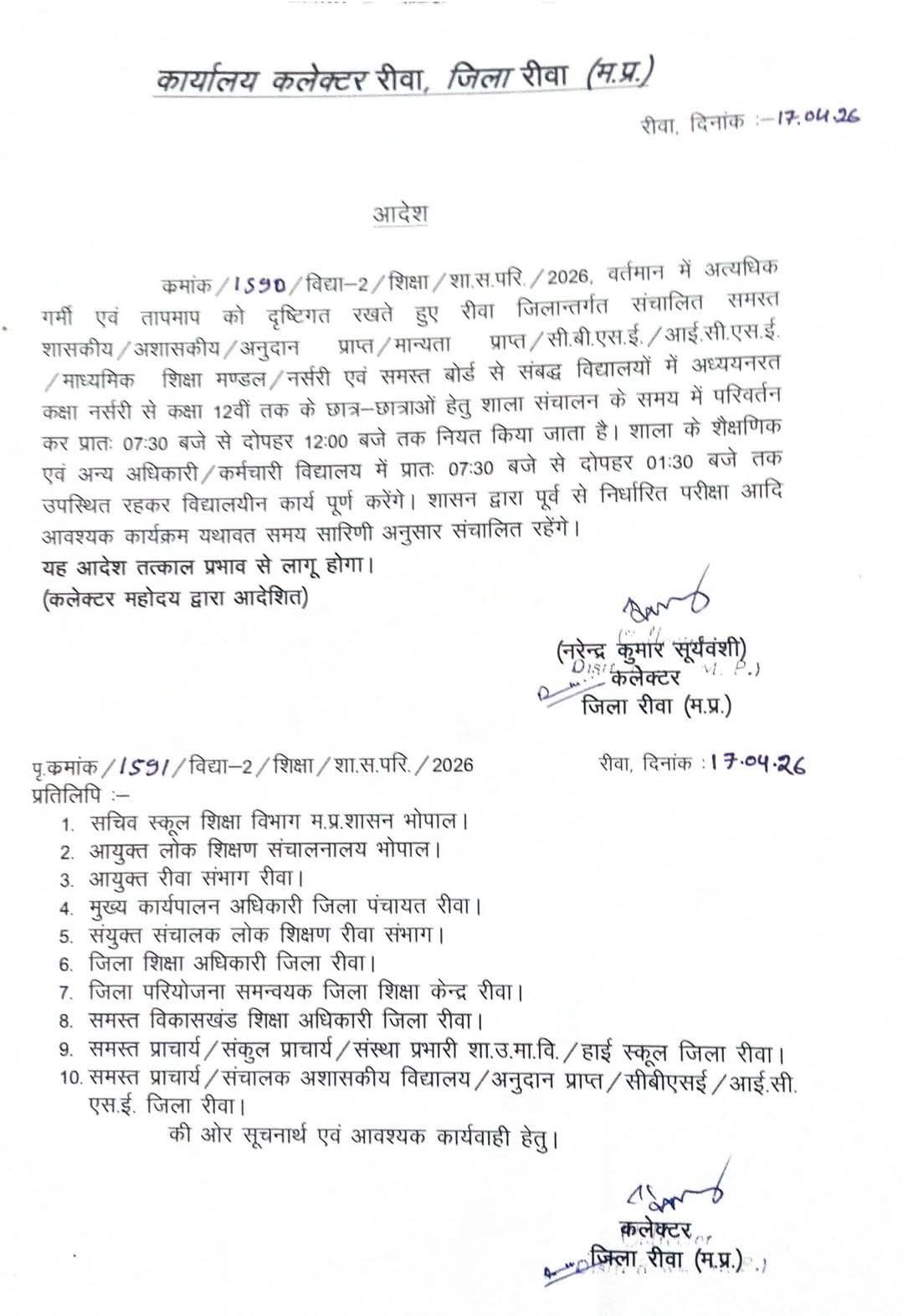 जारी आदेश के अनुसार, रीवा जिले में संचालित सभी शासकीय, अशासकीय, अनुदान प्राप्त, मान्यता प्राप्त, सीबीएसई, आईसीएसई एवं माध्यमिक शिक्षा मंडल से संबद्ध स्कूलों का समय बदल दिया गया है। अब नर्सरी से लेकर कक्षा 12वीं तक के सभी छात्र-छात्राओं के लिए स्कूल सुबह 7:30 बजे से दोपहर 12:00 बजे तक संचालित किए जाएंगे।