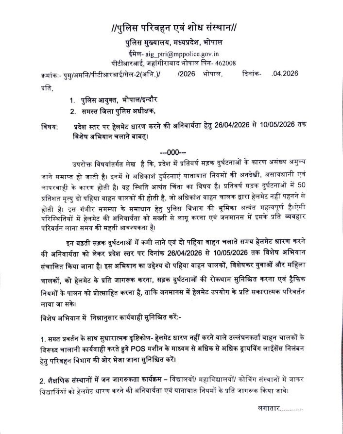 MP News Today: सड़क दुर्घटनाओं में लगातार हो रही बढ़ोतरी और दोपहिया वाहन चालकों की सुरक्षा को ध्यान में रखते हुए ने प्रदेशभर में हेलमेट पहनने की अनिवार्यता को सख्ती से लागू करने का निर्णय लिया है। पुलिस मुख्यालय, भोपाल द्वारा जारी आदेश के अनुसार 26 अप्रैल 2026 से 10 मई 2026 तक पूरे प्रदेश में विशेष अभियान चलाया जाएगा, जिसमें हेलमेट नहीं पहनने वालों के खिलाफ कड़ी कार्रवाई की जाएगी।