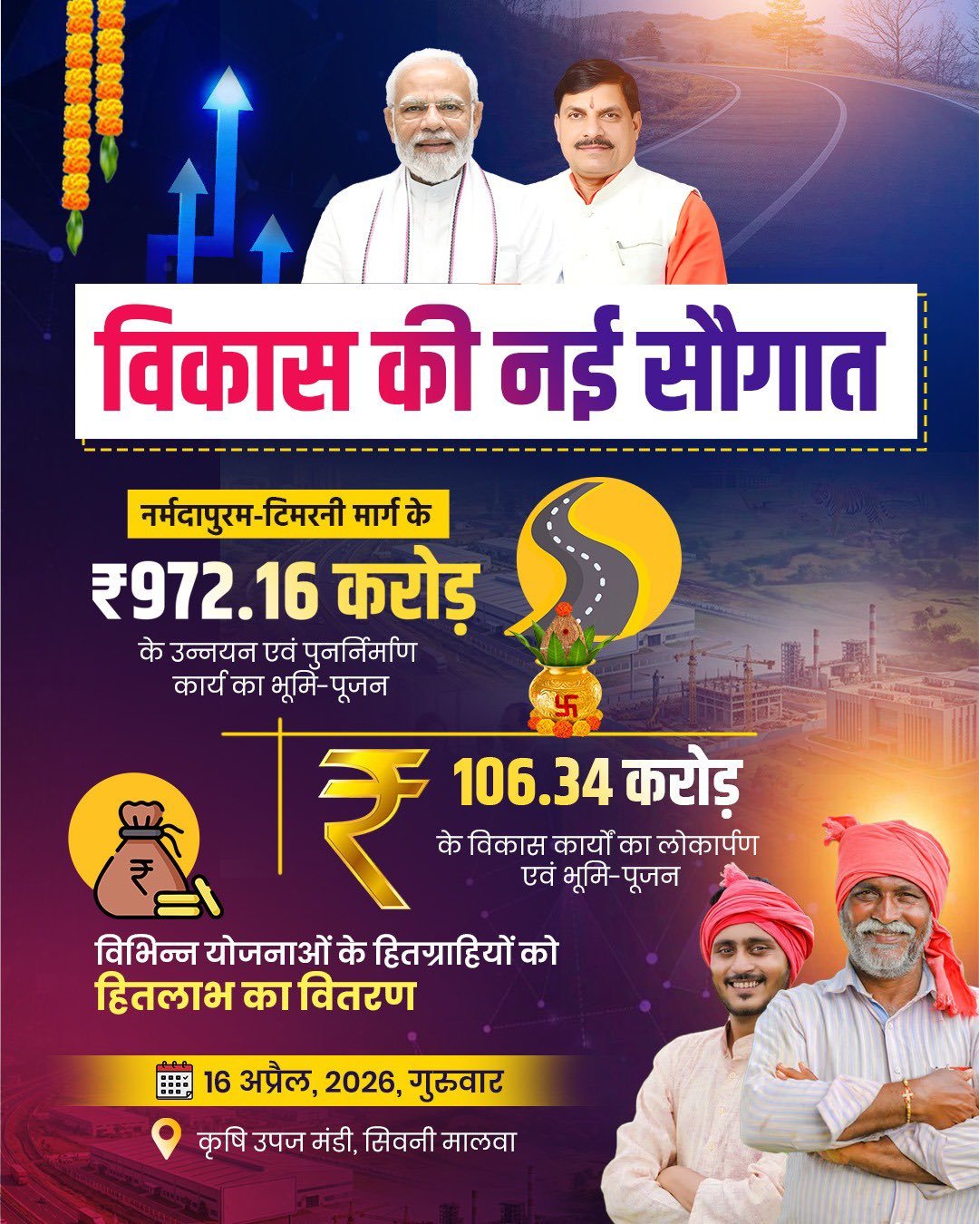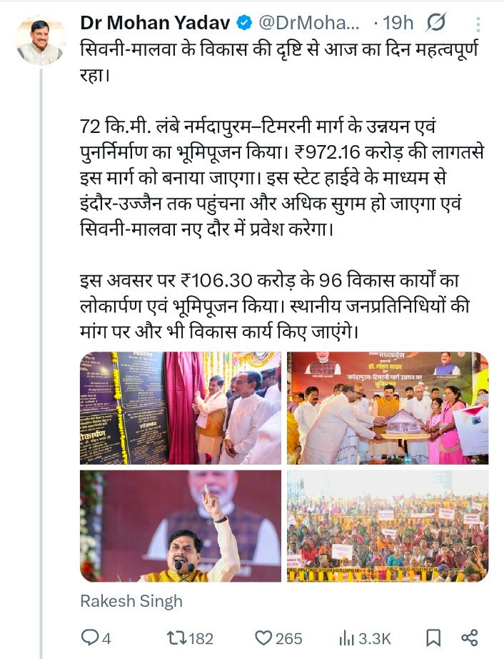 सीएम डॉक्टर मोहन यादव ने नर्मदापुरम – टिमरनी मार्ग के उन्नयन एवं पुनर्निर्माण का भूमिपूजन किया, इस स्टेट हाईवे को 972.16 करोड़ रुपए की लागत से बनाया जाएगा, इस स्टेट हाईवे के माध्यम से इंदौर-उज्जैन तक पहुंचना और अधिक सुगम हो जाएगा एवं सिवनी-मालवा नए दौर में प्रवेश करेगा।