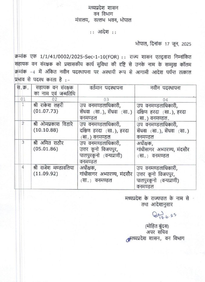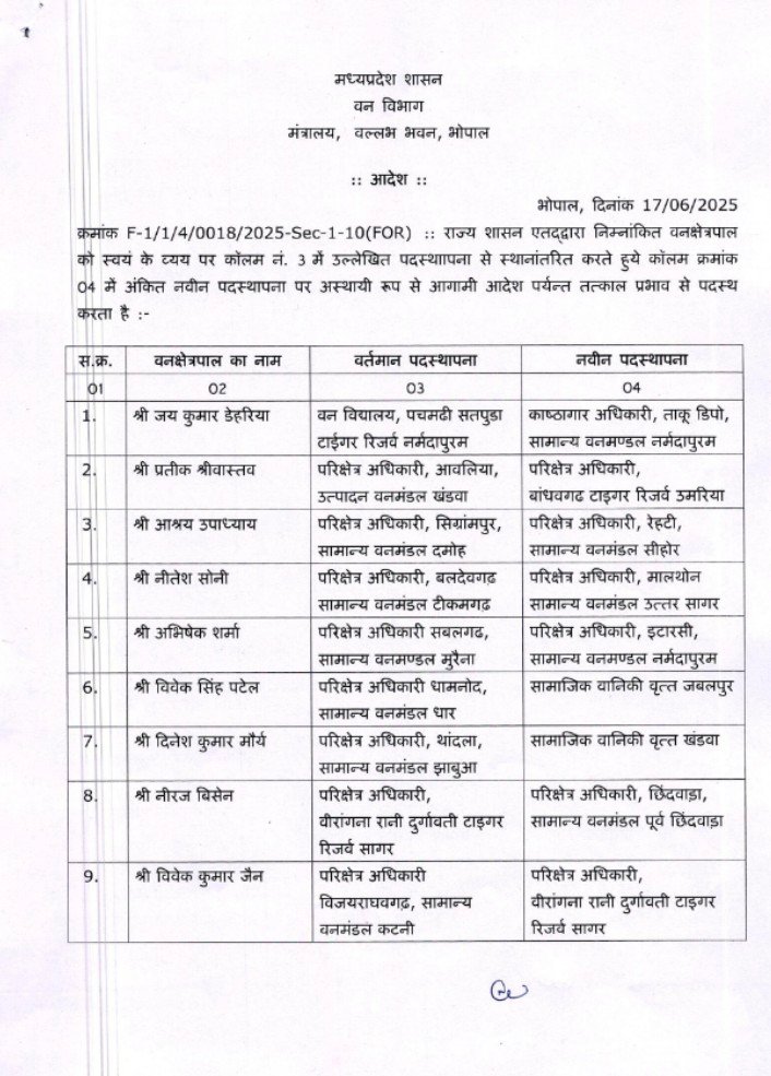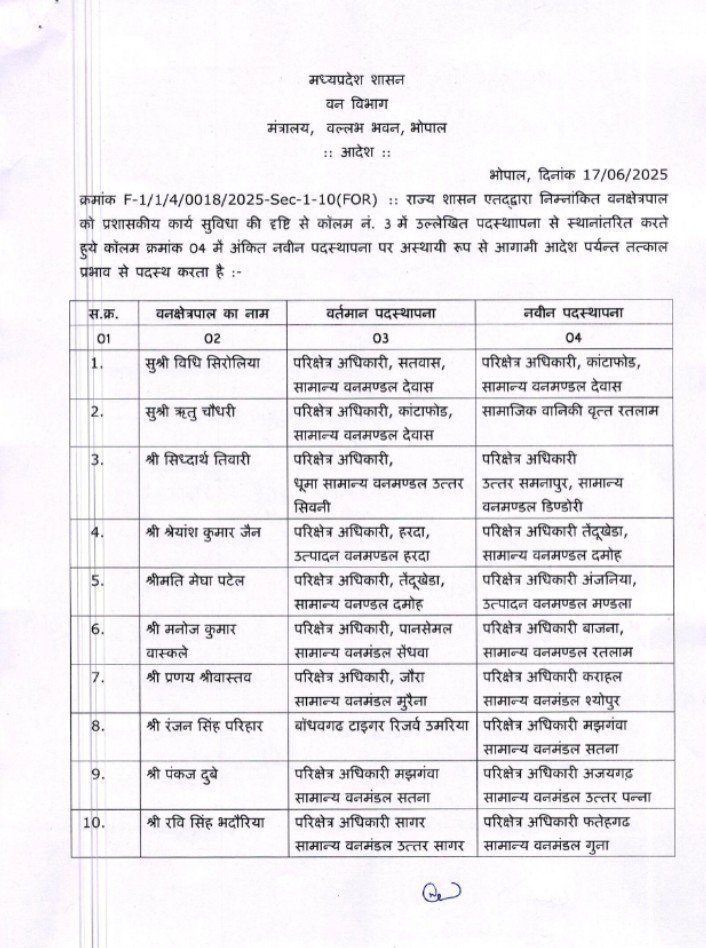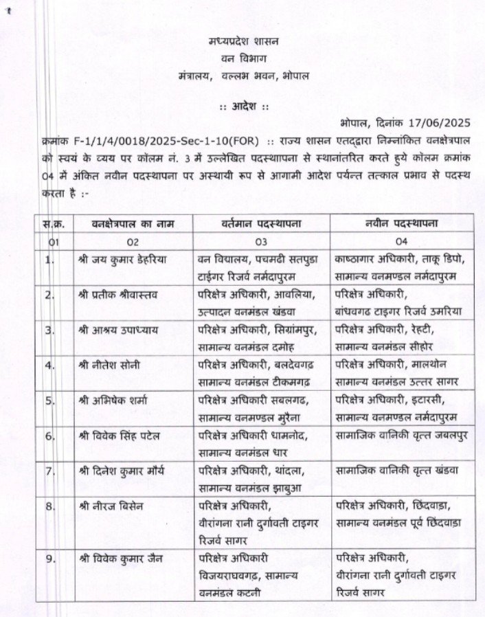 मध्य प्रदेश वन विभाग में बड़े पैमाने पर प्रशासनिक फेरबदल किया गया है। जिसके तहत कुल 215 अधिकारियों के तबादले किए गए हैं। जिसमें से 128 वन क्षेत्रपाल ( फॉरेस्ट रेंजर्स) और 29 वन क्षेत्रपाल स्वयं के वेब पर तथा 58 सहायक वन संरक्षक एवं उपवन मंडल अधिकारी (एसडीएफओ/एसीएफ) सम्मिलित है। यह आदेश वन विभाग के अपर सचिव मोहित बुंदस के द्वारा जारी किया गया है। तथा इसे तत्काल प्रभाव से लागू करने के निर्देश दिए हैं।
